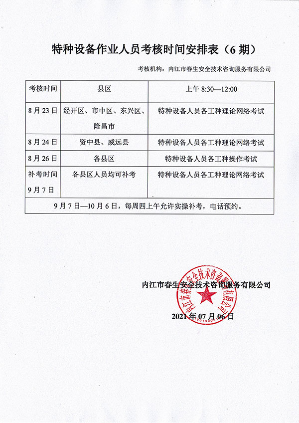 2021年春生公司06期特種設(shè)備作業(yè)人員考核時(shí)間安排