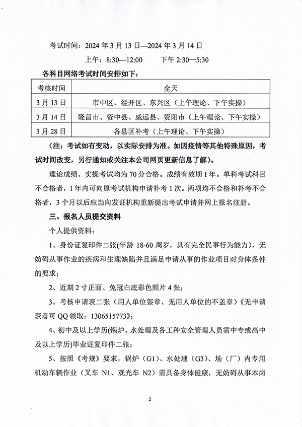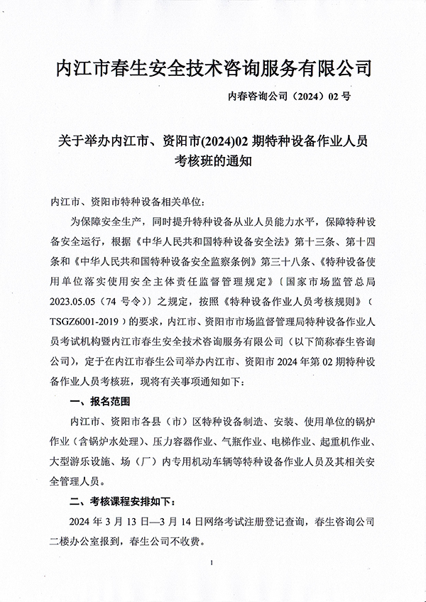 關(guān)于舉辦內(nèi)江市、資陽市(2024)02期特種設(shè)備作業(yè)人員考核班的通