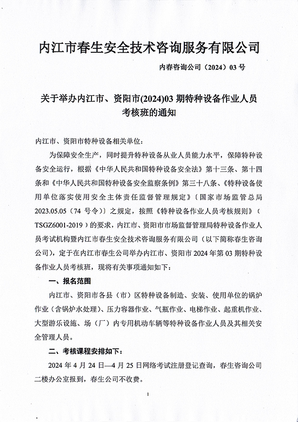 關于舉辦內江市、資陽市(2024)03期特種設備作業(yè)人員考核班的通