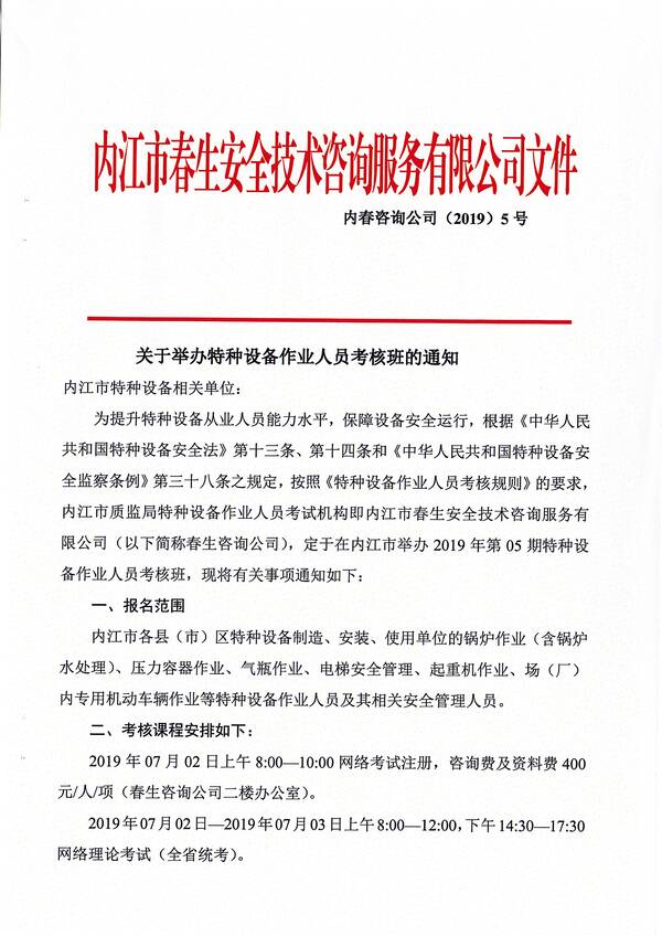 2019年第四期特種設(shè)備作業(yè)人員考核培訓(xùn)班的通知