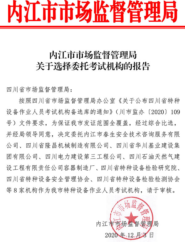 內(nèi)江市市場(chǎng)監(jiān)督管理關(guān)于選擇委托考試機(jī)構(gòu)的報(bào)告