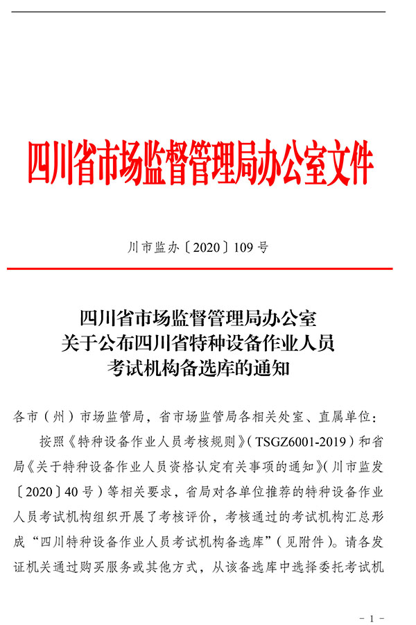 關于公布四川省特種設備作業(yè)人員考試機構備選庫的通知
